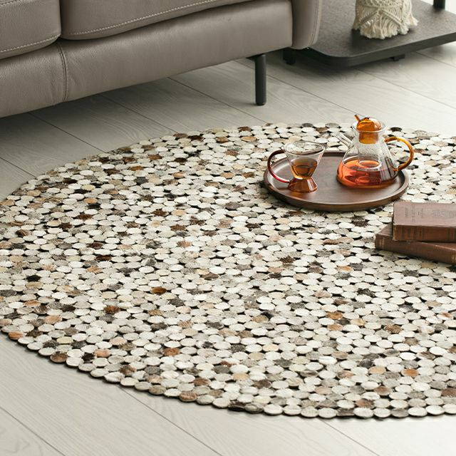 小さなパーツを縫い合わせたパッチワークラグ。天然皮革の濃淡による独特のモザイク柄が空間を華やかに魅せます。