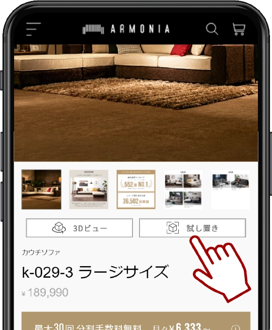 AR体験バナーをタップAR対応商品ページには、「試し置き」ボタンが表示されています。見たい商品のボタンをタップしてください。